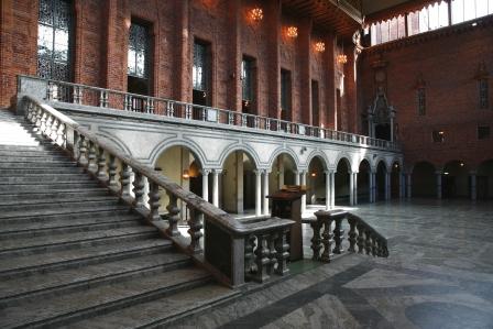 Redan på ett tidigt stadium började Ragnar Östberg tänka på den fasta inredningen och möbleringen. Östbergs ambition framgår av ett uttalande från 1914. Så vitt möjligt ville han åstadkomma interiörer som representerade de olika tidsskeden som Stockholm gått igenom. Detta är en bakgrund till de varierande arkitektoniska uttryck som man återfinner i interiören där även andra kulturella sfärer som Bysans och Islam har lämnat bidrag. I arbetet hade Östberg hjälp av sina begåvade medarbetare. Hans yngre kollega Elis Benckert var redan 1912 anställd för att rita möbleringen. Genom dennes självmord samma år kom denna fråga att skjutas upp till 1915-16. De som huvudsakligen ansvarat för möblerna är Ernst Spolén, Carl Malmsten och Fredrik Wetterqvist. En kortare tid var även Gunnar Asplund anställd för att rita möbler till korridorerna. Maja Sjöström var bosatt i flera år i Rom och för att se till produktionen av de av henne ritade praktfulla möbeltextilierna vilka tillverkades i Venedig.
